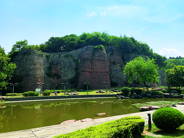 远观石头城,“鬼脸照镜”一景虽是奇特,可也不难发觉城下已再无潮起浪涌的辽远苍茫,只余小小的一方水塘。斗转星移,长江西迁,泥沙淤沉,不仅剥去了石头城以往倚山临江的险要地势,更使江水拍岸的壮阔之景不复存在,不免有些许可惜。即便如此,伫立在石头城下,仰头望去,仍能感到昔日东吴军事要塞的磅礴气势。墙体高耸巍峨,岩壁笔直平整,虽是饱经风霜,却依旧呈现出高傲矜贵的棕红色,仿佛在诉说着此地为帝王故地,颇为奇特有趣。